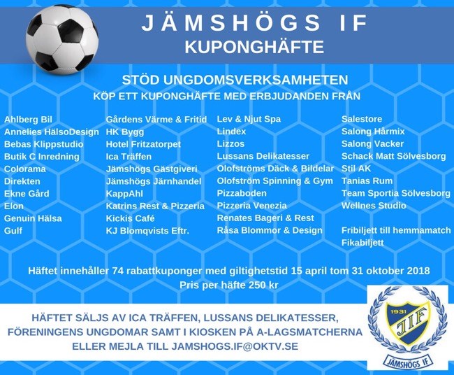 Så äntligen kom då våren! Snö och kyla har gett med sig. Det såg oroligt ut ett tag men redan på måndag(16/4) släpps gräsplanerna för träning och det blir liv och rörelse på Motorpa igen! I stort sett varenda kväll har vi aktivitet på idrottsplatsen. Allt ifrån Knot- Knattefotboll till de riktigt stora tjejerna och grabbarna. Seriepremiär hemma blir det för våra herrar i div 4, lördagen den 21/4, då man gästas av IF Trion kl 14.00. Jämshögs IF skulle vilja passa på att tacka alla fantastiska människor som engagerar sig och alltid ställer upp när det behövs! Man känner sig både glad och stolt varje gång man går in och ut genom Motorpavallens grindar ! Den sk vårstädningen är nu avklarad och den grillade korven efter smakade toppen! Tack alla som var här och putsade, fejade, rensade,"kastade" och grillade!! Föreningen har varje år återkommande arrangemang inbokade. Vi har samarbete med LIONS i Olofström där vi ställer upp som parkeringsvakter vid Holje Marknad 11-13 maj, tätt följt av Zonläger i samarbete med Blekinge FF under Kristi Himmelsfärds helgen. Vi har en nyhet för i år som vi hoppas skall bli en tradition. Vi tänker ställa till med "Kaffekalas"!! Söndagen den 3 juni. Mer information kommer när det närmar sig! Vi har Sweden Rock festival i början av juni samt Fotbollsskola för barn i åk 1-6 under vecka 25. Firande i byn på Midsommaraftons förmiddag med provsmak på matjesillen och kaffe med dopp tillsammans med ICA-Träffen. Årets Loppmarknad är planerad till den 4 augusti. Lotteri, korvgrillning, kaffeservering och möjligheter att ”fynda” i vanlig ordning. Två-kronasmatch/sponsordag är inplanerad lördagen den 11 augusti då Jämshögs IF gästas av Hällaryds IF. Fotbollskväll och andra samkväm är i planeringsfas än så länge. Så känn Er hjärtligt välkomna att vara med!! Efter månaders förberedelser är den snart här! JIF-boken, som du kommer att få i brevlådan! I den hittar du fina lagbilder samt information om föreningen och våra arrangemang som kommer att ske under 2018. Här finns också alla våra fantastiska sponsorer som vi hoppas ni gynnar under året ! Föreningens alla matcher finner ni här på hemsidan! Hjärtligt Välkomna till ett nytt fantastiskt år med Jämshögs IF , väl mött på vackra Motorpavallen!